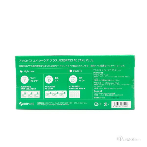 広告文責:株式会社あけぼの薬局 TEL 0466-52-4105 メーカー名:株式会社RAPHAS JAPAN TEL 03-6806-0513 区分:化粧品 製造国:韓国 全成分: [ナイトケア用] アクロパス スキンクレンザー:エタノール、水、ティーツリー葉油、サリチル酸、酢酸トコフェロール アクロパス エイシーケア(Microcone Patch):加水分解ヒアルロン酸、ナイアシンアミド、オリゴペプチド-76、水酸化Na [デイケア用] デイケアパッチ(ハイドロコロイド素材) <注意事項> ◆店頭在庫と共有のためご注文頂いた時点で店頭販売と重なり欠品している場合がございます。