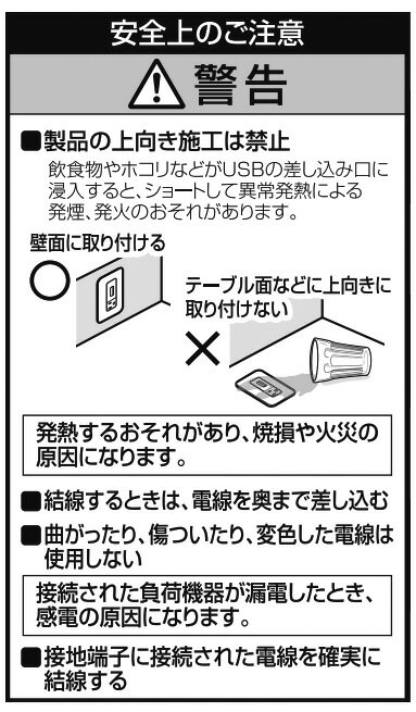 メーカー:Panasonic / パナソニック電工 (旧ナショナル National 松下電工) シリーズ名:埋込[充電用]USBコンセント USBコンセント 定格入力:AC100V 30VA 定格出力:DC5V 合計3A 扉付接地コンセント 定格:15A 125V 製品の上向き施工は禁止 飲食物やホコリなどがUSBの差し込み口に侵入するとショートして異常発熱による発煙、発火の恐れがあります。
