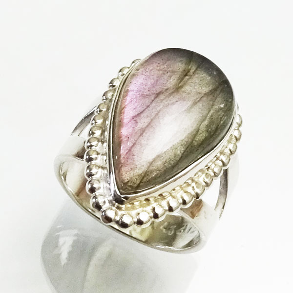 ラブラドライト ピンク 激レア シルバーリング【受注製作】涙型 925 二股アーム シンプル 天然石 POW-WOW 手作り【13号〜24号まで】