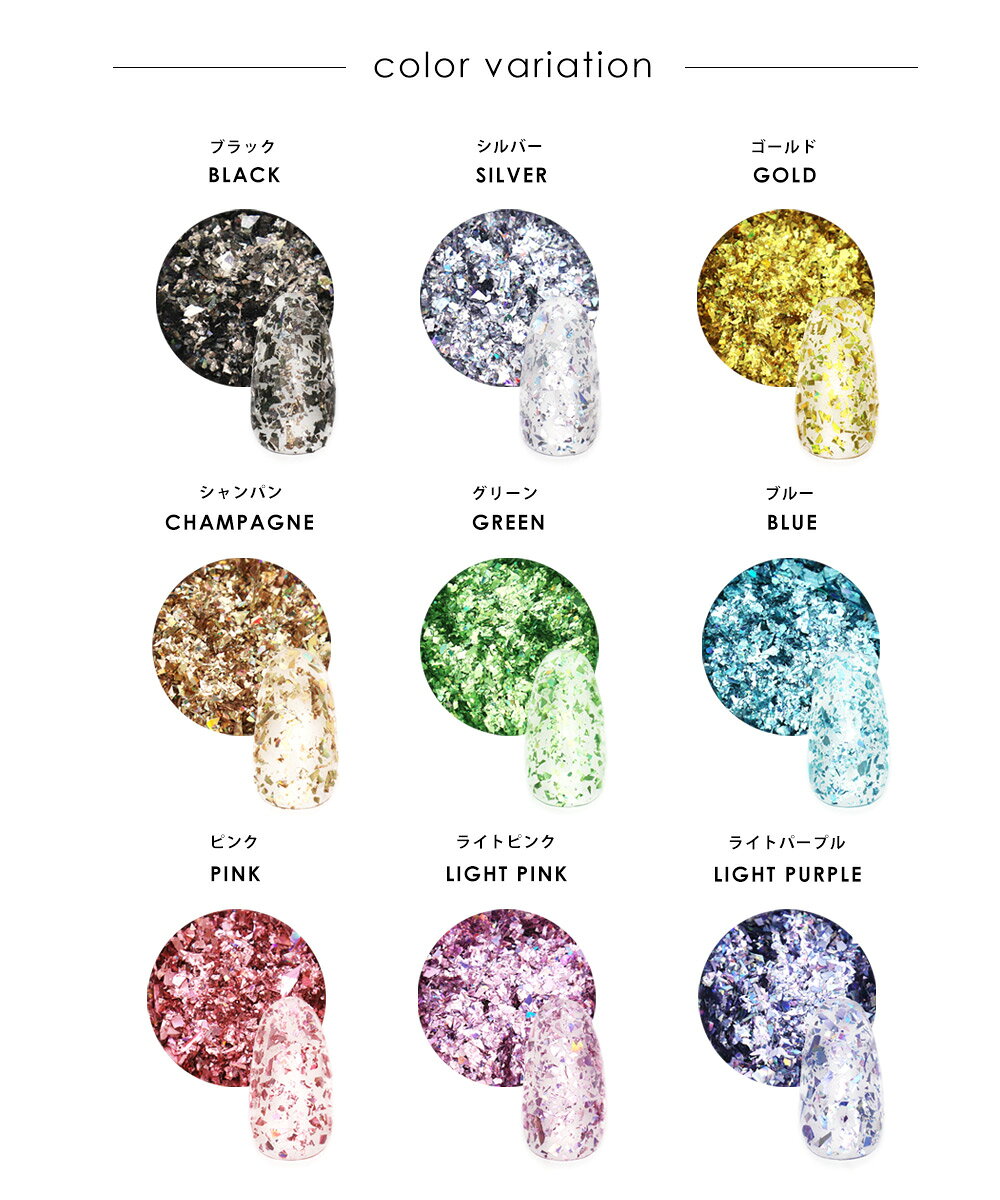 特徴 ランダムに細かくカットされた煌くホログラム クリアベースの上でも綺麗に高発色! 極薄だからジェルの埋め込みも楽々♪